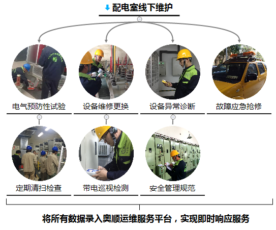 电力用户配电室内所使用的各类电力设备(包含:高压开关柜、低压开关柜、电容柜、变压器、电线电缆、仪器仪表、综合保护等),需要日常定期的维护,随着设备不断老化,人员成本日益增加,那么就需要更加专业的运维团队,提高效率降低成本。